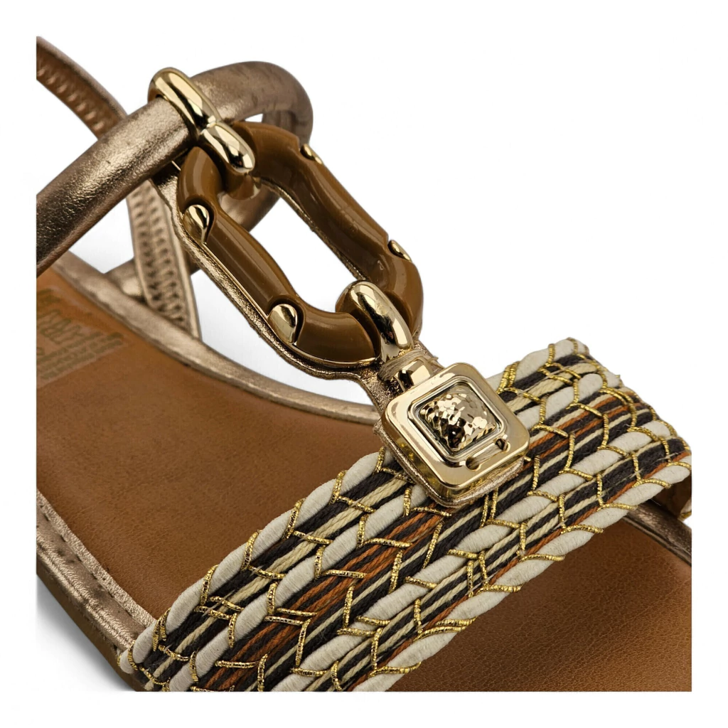 O acabamento metalizado da sandália adiciona um toque de sofisticação, complementando as pedras decorativas e o brilho do lurex.