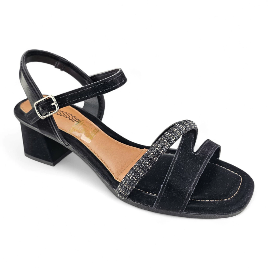 Sandália Mississipi MF862 Salto Bloco Camurça Strass - Preto - 5,5 cm