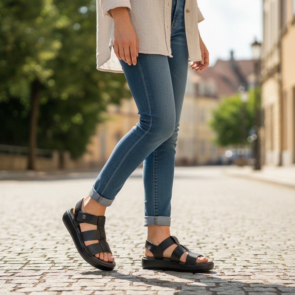 Design com salto plataforma, que oferece maior conforto ao caminhar e distribui o peso de forma equilibrada, ideal para uso prolongado.