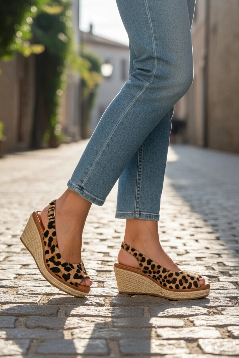 Combine a sandália de leopardo com peças neutras para um look equilibrado e elegante.