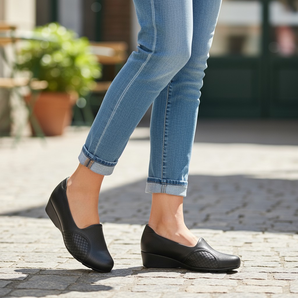 O salto anabela de 30mm oferece a altura ideal para manter a postura correta e distribuir o peso de forma equilibrada, reduzindo o impacto.