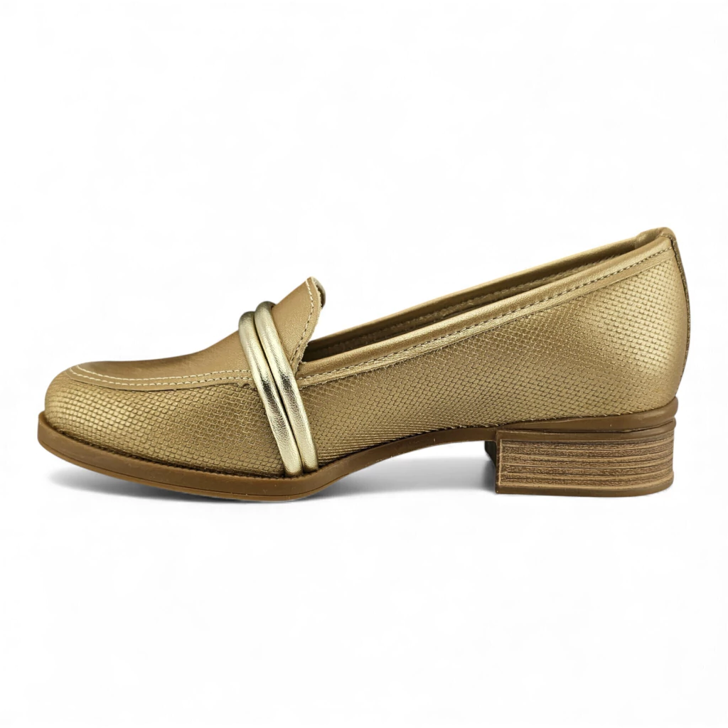 Design clássico de mocassim feminino com detalhes em tiras douradas que elevam o estilo.